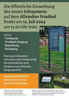Am Freitag, 12. Juli 2024, soll um 15 Uhr die Einweihung des vom Heimatverein errichteten neuen Infosystems auf unserem schönen Allstedter Friedhof stattfinden.
