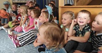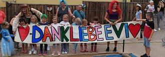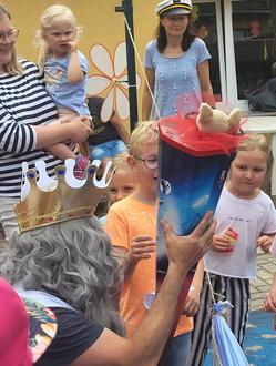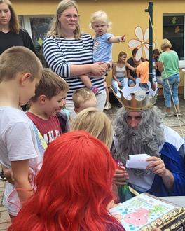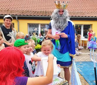 So nass wie es im Meer ist, so nass war es auch plötzlich bei uns. Kurz vor Beginn gab es ein Gewitter mit heftigen Regen. Doch wir lassen uns davon doch nicht abhalten. Bei schönem Wetter kann schließlich jeder feiern. Spontan fingen wir in den Räumen der Kita mit einer Zaubershow an. Und so schnell der Regen kam, verschwand er auch wieder. Also Gummistiefel an und alle,Mann‘ nach draußen ins herrliche Wetter. Da kam auch schon Besuch aus dem Meer. Neptun kam mit Arielle zu uns, um alle Kinder mit einem Spritzer Meerwasser zu taufen. Was für lustige Namen es doch im Meer gibt. Man musste manchmal schmunzeln. Schließlich hatte sich in seinem großen Netz noch etwas anderes verfangen. Die Zuckertüte für unseren Einschüler. Da wurden die Augen groß, war doch die Tüte über Nacht noch kräftig gewachsen. Nicht nur für ihn beginnt ein neuer Abschnitt, sondern auch für eine Erzieherin. Nachdem wir schon Anfang des Jahres unser „Fleißiges Bienchen“ Ina nach 42 Arbeitsjahren in den wohlverdienten Ruhestand verabschiedeten, so war jetzt Tante Evi dran. Auch sie darf sich nun ausruhen und die Rente, ebenfalls nach 42 Jahren, genießen. Beide waren von Anfang an, schon beim Aufbau der damaligen Krippe dabei. Da ist es verständlich, dass das ein oder andere Tränchen floss. Wir bedanken uns hiermit noch einmal bei Beiden und wünschen ihnen alles Gute. Viel Spaß hatten wir auch beim Familienspiel und beim „Wortkartonrätsel“. Und so fiel es gar nicht auf, dass Karussell und Hüpfburg fehlten, denn diesen sagten wir kurzfristig ab. Bei der Tombola gab es auch viele schöne Preise - kleine und große.