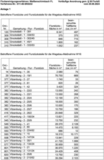 Zur Bereitstellung von Flächen für die Realisierung der Maßnahmen des Wege- und Gewässerplanes mit landschaftspflegerischem Begleitplan (Plan nach § 41 Flurbereinigungsgesetz ( FlurbG)), genehmigt am 15.09.2022, geändert am 20.06.2024, im Flurbereinigungsverfahren Weißenschirmbach (FL) wird für die Wegebaumaßnahmen W02A, W16, W25, W38, W42, W43 sowie die Maßnahme G02 der Teilnehmergemeinschaft (TG) Folgendes angeordnet: