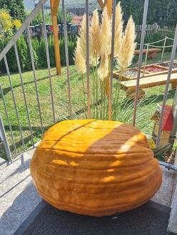 Im Frühjahr pflanzten sie in ihrem Beet auf dem Kitagelände eine Kürbispflanze und nach monatelanger Pflege (viel Wasser) wuchs ein 29kg schwerer Kürbis heran.