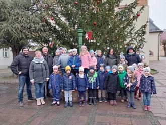 Traditionell zu Weihnachten gehört ein Tannenbaum und ihn zu schmücken. Dieses Jahr bat die Stadt Allstedt die Kitas, die Grundschule und Jugendeinrichtungen, den Weihnachtsbaum der Stadt (neben dem Rathaus) mit zu schmücken. Dafür bastelte unsere Spatzengruppe Weihnachtsdeko und ging gemeinsam mit den großen Gruppen zum Schmücken des Baumes. Am Rathaus angelangt, wurden wir vom Bürgermeister Jürgen Richter und dem Jugendbeauftragten Marc Baage in Empfang genommen. Danach hingen die Kinder die schönen Basteleien an den großen Baum. Ein jeder konnte sich nun über die hübschen Dekorationen freuen.