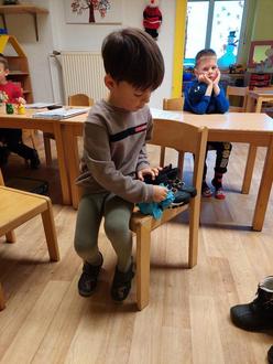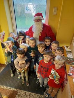 Trotz hoher Krankheitsfälle haben wir uns den Nikolaus nicht vermiesen lassen. Es wurden wie gewohnt die Schuhe geputzt und danach ordentlich auf den jeweiligen Platz gestellt. Anschließend wurde gewartet und gebangt ob der Mann in der roten Kutte denn wirklich kommt. Tatsächlich hatte sich der Fleiß ausgezahlt. Der Nikolaus (alias Thomas Fulczyk) kam sogar persönlich mit seinem motorisierten Untersatz unsere Kita besuchen. Er hatte sich ein paar Lieder aus unserem Repertoire zu Gemüte führen lassen und war für ein Foto nicht verlegen. Als er wieder weg war, riskierten wir einen Blick in die Schuhe und zum Erleichtern der Kinder waren diese gefüllt. Die Freude über die Nikolaustüten war ihnen anzusehen.