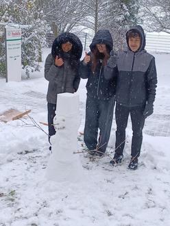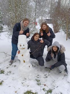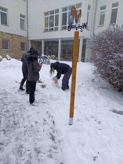 Am 18. Januar hat uns alle das Wetter mit einer großen Ladung Schnee überrascht. So schön die weiße Landschaft auch aussieht - die Bewohner in Pflegeheimen gehen bei diesem Wetter eher nicht vor die Tür. Also dachten wir uns, dass die Schülerinnen und Schüler Schneemänner bauen, die von den Bewohnern gut zu sehen sind. In einer reichlichen Stunde entstanden dann drei aus Schnee gebaute Figuren, wir wollen ja allen Geschlechtern gerecht werden. Die Schülerinnen und Schüler hatten viel Spaß und haben gemerkt- im Winter ist es kalt.