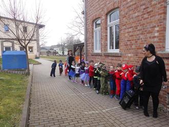 Am Dienstag, dem 21.02.2023 wurde das Faschingsfest in unserer Kita zelebriert. Die Kinder waren schon sehr gespannt darauf und machten sich schon Tage vorher Gedanken über ihre Kostümauswahl. Bei so vielen unterschiedlichen Geschmäckern gab es die verschiedensten Kostüme zu bestaunen. Diese gingen von Berufen wie Feuerwehrmann/Polizist, über Tiere bis hin zu Superhelden und Prinzessinnen. Da hatten ihre Eltern wieder ganz tolle Sachen organisiert. Ab 7:30 Uhr hallte die Faschingsmusik durch unsere Räume und sorgte für ausgelassene Stimmung und Partylaune bei den Kindern und ihren Erziehern. Der Bäcker hatte uns mit verschiedenen lustigen Gesichtern auf den Schnitten und den traditionellen Pfannkuchen ein faschingstypisches sowie leckeres Frühstück und Vesper zubereitet. Unsere Vorschulgruppen machten sich 9:30 auf den Weg zum Heimatverein von Allstedt, um dort den Faschingsumzug ein Stück weit zu begleiten. Währenddessen feierten die jüngeren und die mittleren Gruppen eine Partysause in der Kita. Eröffnet durch lustige Kindertänze vertrieben sie sich die Zeit mit traditionellen Spielen. Auch reichliche Naschereien standen den Kindern zur Verfügung, dafür sagen wir DANKE an die lieben Eltern!
