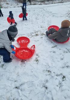 Schlittenfahren, Schlittenfahren macht uns großen Spaß! Erst klettern wir den Berg hinauf und steigen auf den Schlitten drauf. Dann sausen wir hinunter und fallen - plumps!- herunter. Wir rollen durch den Schnee! Zum Glück tut´s garnicht weh!