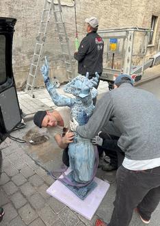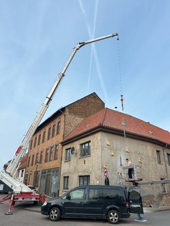 Ein Jahr lang haben die Künstler in ihren Ateliers gearbeitet und nach Ostern mit dem Aufbau der Kunstwerke vor Ort in Allstedt begonnen. Wer nicht dabei sein konnte, kann die Impressionen und Videos von dieser aufregenden Aufbauwoche noch einmal auf der Instagram- und der Facebook-Seite der Kunststiftung des Landes Sachsen-Anhalt betrachten. So konnte der Bildhauer Hermann Grüneberg mit Unterstützung der Allstedter Dach- und Sanierungsfirma Knobloch seine Installation „Seyt noer keck!“ an eine Hausfassade gegenüber der Bäckerei Meye anbringen.