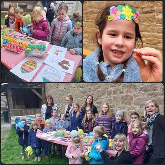 Dann ging es im Gänsemarsch zurück in den Hof, wo die Kinder ihr Werk an bunten Eiern und Basteleien bestaunen konnten.