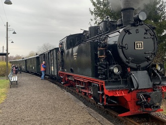 Bei (fast wie immer) etwas schlechterem Wetter trafen wir uns um 13.45 Uhr in Benndorf am Bahnhof und dort wartete schon die Dampflok auf uns. Sehr gut beheizte Waggons luden zu einer angenehmen Fahrt durch die noch etwas verschlafene Natur ein. Der Regen begleitete unseren Nachmittag. Davon ließen wir uns aber nicht einschüchtern, wir hatten ja die richtige Kleidung an.