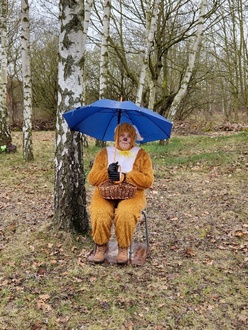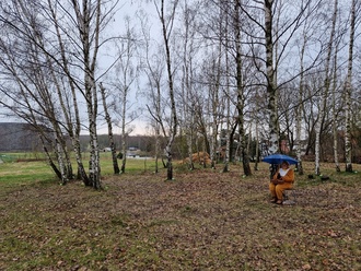 Bis zum Eduardschacht verging die Fahrt wie im Fluge und plötzlich entdeckten wir vom Zug aus schon den Osterhasen. Dieser saß gemütlich mit dem Schirm auf der Wiese und erwartete uns.