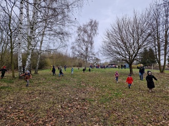 Voller Spannung warteten die Kinder auf den Startschuss und begrüßten den Osterhasen. Ganz zufällig fanden sie noch eine kleine Osterüberraschung im Gras und der Hase hatte noch einige Leckereien in seinem Körbchen.