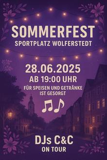 Der SV Rohnetal Wolferstedt e.V. lädt herzlich zum Sommerfest am 28. Juni ab 19:00 Uhr auf den Sportplatz ein. Der Verein stellt wieder ein buntes Programm auf die Beine mit Leckereinen vom Grill, erfrischenden Getränken und fetziger Tanzmusik - eine wunderbare Gelegenheit, zusammenzukommen und einen Sommerabend in geselliger Runde zu verbringen. Schauen Sie vorbei!