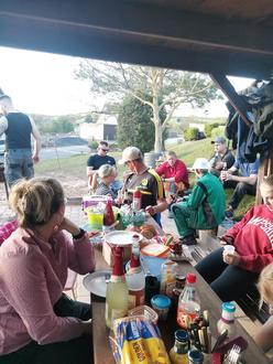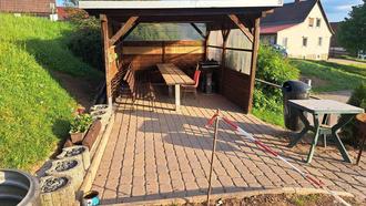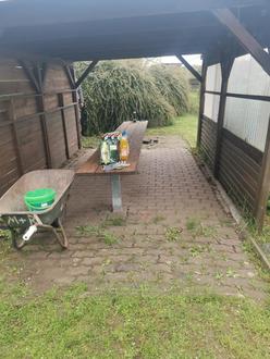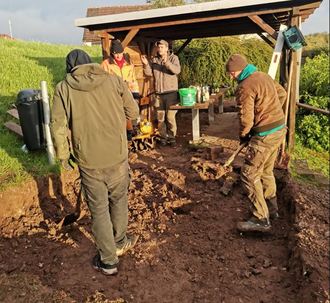 Am 19.04.2024 bei anfänglichen guten Witterungsbedingungen begannen wir um 15.00 Uhr mit den Abtragen des alten Pflasters. Danach musste der Aushub für den Unterbau des neuen Pflasters hergestellt werden und da kamen wir mit unseren Hilfsmitteln wie Schippe, Karre und Spaten direkt an unsere Grenzen. Wie es der Teufel wollte setzte auch noch Regen ein und es wurde schlammig. Kurze Krisenbesprechung und die Lösung kam prompt. „Meppi muss her, um die Erde aufzulockern, gleich heraus schippen und direkt am Blumenbeet daneben breit schaufeln!“: so die Worte von Andy Meyer. Alle schauten sich an, überlegten kurz, wussten nicht was oder wer mit „Meppi“ gemeint ist, stimmten aber zu. Um weitere Baumaterialien und Absperrbaken zu holen kam der kleine rote Traktor inkl. Hänger von Quentin in Aktion. Nicht so viel geschafft, wie geplant, legten wir zusammen die Arbeit am späten Abend nieder, um am nächsten Morgen zeitig zu beginnen. Mit einem Geburtstagskind in der Runde und einem kleinen Umtrunk und der Überraschung, dass uns vom Mitglied des Ortschaftsrates Maik Bergmann 7 Borde zum Verbau zur Verfügung gestellt wurden, startenden wir in die nächsten Phase der Bauarbeiten. Es wurde Erde auf die umliegenden Flächen verteilt, um Unebenheiten auszugleichen und Grassamen gestreut, Fließ verlegt, Schotter und Kies gefahren. Am Nachmittag wurde uns von Familie Rüppner noch die Rüttelplatte zur Verfügung gestellt. Über die Woche hin, trafen wir uns nach Feierabend bis auf Mittwoch und Freitag, so wie jeder Zeit hatte, um dem Ziel zur Fertigstellung am Samstag näher zu kommen. Wir haben das Ziel erreicht! Am Samstag, den 27.04.2024 um 15.00 Uhr haben wir das Projekt „Hirtbergbaude“ abgeschlossen. Alle die an diesem Projekt beteiligt waren, trafen sich dann noch zum gemütlichen Grillabend. Die Initiative für die Instandsetzung der Hütte haben Familie Meyer, Familie Greif und Familie Münch ergriffen und sich auch für die Beschaffung der Baumaterialien, ob aus eigenen Beständen oder privat dazu gekauft, benötigte Genehmigungen von der Stadt Allstedt, wie die Sondernutzung zur Lagerung von Baumaterialien gekümmert. Auch wurden uns zur Sicherheit Schachtpläne zur Verfügung gestellt. Für die komplikationslose Abwicklung möchte ich mich noch einmal bei Herrn Lisker, Herrn Hofmann und Frau Meyer bedanken. Ein großer Dank für die tatkräftige Unterstützung geht an Sascha, Robert und Stephanie, Waldi und Daniela sowie Martin. Die Hirtbergbaude in Emseloh ist für jedermann zugänglich. Gerne verweilen dort Spaziergänger, Fahrradfahrer zu einer kurzen Verschnaufpause oder unsere Jugend. Es ist nun wieder ein schönes und sicheres Plätzchen mit schöner Aussicht in Richtung Kyffhäuser geworden.