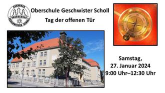 Am Sonnabend, dem 27 Januar 2024 findet in der Geschwister-Scholl-Oberschule Auerbach (Bertolt-Brecht-Straße 17) von 09:00 Uhr bis 12:30 Uhr ein „Tag der offenen Tür“ statt. Dazu sind besonders die Schülerinnen und Schüler der jetzigen 4. Klassen und deren Eltern - aber auch alle anderen Interessierten - eingeladen.