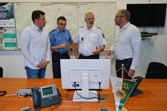 Von rechts: Oberbürgermeister Jens Scharff, Revierleiter Jens Oppel, Leiter-Streifendienst Jens Scholze und Moritz Zierold vom Ordnungsamt