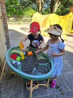 Das Außengelände der Kita verwandelte sich bei schönstem Sommerwetter in verschiedene Stationen rund um das Thema Ernte und Spätsommer. Es gab eine Welt der Sonnenblumen, der Äpfel, der Kartoffeln, des Waldes und des Getreides. Hier konnten die Kinder mit ihren Familien in ganz unterschiedliche Aktivitäten eintauchen. In der Waldecke z.B. konnte mit Stöcken, Zapfen und Wolle gebastelt oder Nägel in Holz geschlagen werden. In der Welt der Kartoffeln gab es Kartoffeldruck, eine Kartoffelzählmaschine und ein Kartoffel Memory. Bei dem Getreide konnten Maispüppchen, Körnerkissen und herbstliche Gestecke hergestellt werden. Auf der Sonnenblumenterrasse konnten die Kinder Gipsfiguren bemalen, Zaubersonnenblumen basteln oder einfach in einer großen Wanne mit Sonnenblumenkernen spielen. Äpfel konnten geangelt und ein Apfelwurm gesucht werden. Wettspiele mit Eimern, Schubkarren und kleinen Fahrzeugen wurden ebenfalls gut angenommen.