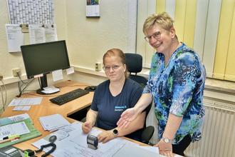 Sylvia Puggel, eine Beschäftigte der Werkstatt, verbrachte im Umkehrschluss ihren Arbeitstag in der Poststelle/Zentrale der Stadtverwaltung Auerbach/Vogtl. (auf dem Foto mit Rathaus Mitarbeiterin Monika Kunz)