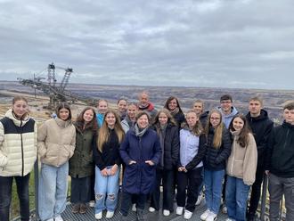 Tag zwei begann dann mit einer Trennung der Schüler aus Grevenbroich und Auerbach. Während unsere Partnerschüler in den Unterricht mussten, durften wir eine Führung durch die Schule genießen, welche knapp 75 Jahre jünger ist als unsere eigene und circa das doppelte an Schüler beherbergt. Nach einer weiteren lustigen Busfahrt erreichten wir dann der Tagebau Garzweiler und hörten uns einen Vortrag über den Braunkohleabbau an sich, aber auch die Folgen für Mensch und Natur, sowie den Prozess der Renaturalisierung an.