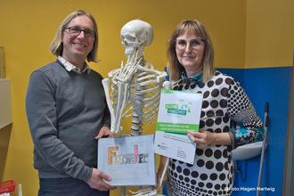 Jörg Krenkel, Netzwerkkoordinator in der Stiftung „Haus der kleinen Forscher“ (auf dem Foto mit Birgit Lorenz und dem „Hort-Skelett“), lobte die Inititiative der Diesterwegschule und kündigte an, dass sich gegenwärtig weitere Auerbacher Erzieherinnen für das „Kleine-Forscher-Projekt“ interessieren und weiterbilden. (@Foto: HH)
