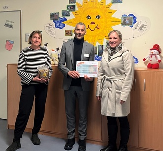 Der zweite Teil des Geldes konnte kurz darauf ebenfalls symbolisch von Frau Y. Lehmann an die Psychologische Psychotherapeutin Frau Görner sowie den Chefarzt der Kinder- und Jugendpsychiatrie Rodewisch, Dr. med. Liskowsky, überreicht werden. Beide engagieren sich im Seiltänzer e.V., dem Förderverein der Kinder- und Jugendpsychiatrie Rodewisch, welcher wertvolle Arbeit leistet. So unterstützt der Verein finanziell, wo andere Maßnahmen enden. Ziel ist es, psychisch benachteiligten Kindern und Jugendlichen Gelder bereitzustellen und die betroffenen Familien individuell und unbürokratisch zu unterstützen. Die beiden erzählten z.B. von einem Jungen, der unkompliziert und in kürzester Zeit sein erstes eigenes Paar Turnschuhe erhielt. Einem anderen Kind konnte ein Schwimmkurs ermöglicht werden. Im Moment besteht der Wunsch, vor dem Klinikgebäude ein Klettergerüst zu installieren. Wie Frau Görner berichtete, halten sich manche Patienten mehrere Wochen in der Klinik auf. Umso wichtiger ist es, ihnen einen sicheren und ansprechenden Ort zu schaffen, an dem sie genesen können. Die mitgebrachten Süßigkeiten wurden gleich von den anwesenden Kindern in Empfang genommen.