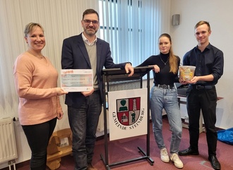 Das ermöglichte uns eine Spende von 1000 Euro an die Gemeinde Steinberg. Der Betrag kommt der Kindertagesstätte „Steinbergwichtel“ Rothenkirchen zugute. Die Einrichtung ist seit einem Brand im Mai 2024 nicht mehr nutzbar. Bei einem Besuch unserer Schulleiterin Frau Fehlberg, der Beratungslehrerin Frau Y. Lehmann, der Schülersprecherin Laura Voigt und dem Schüler Tim Löffler aus Klasse 10 bei Bürgermeister Herrn Gruner im Rathaus Rothenkirchen wurden das Engagement und die Bemühungen deutlich, den Kindern und dem Personal der Kindertagesstätte so schnell wie möglich einen funktionalen, aber auch äußerst ansprechenden Neubau zur Verfügung zu stellen. Mit großer Freude nahm Herr Gruner den symbolischen Spendenscheck und einen süßen Gruß für die Kinder entgegen.