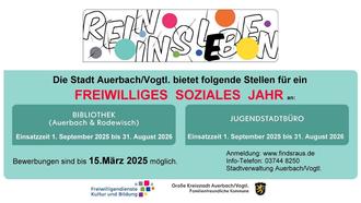 | Die Stadt Auerbach/Vogtl. bietet folgende Stellen für ein „Freiwilliges Soziales Jahr“ (FSJ) für die Einsatzzeit September 2025 bis August 2026 an: | |