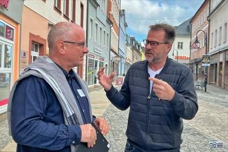 Nach einer Vorstellung der Drei-Türme-Stadt durch Auerbachs Fachbereichsleiter Knut Kirsten gingen die Studenten gemeinsam mit Gisbert Günther, Dozent für Handel und Marketing, auf Befragungstour (auf dem Foto mit Citymanager Uwe Prenzel).