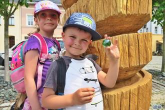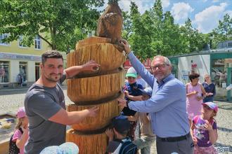 Gemeinsam mit Mädchen und Jungen aus der Kita „Sonnenschein“ eröffnet am 20. Juni 2023 Auerbachs Oberbürgermeister Jens Scharff eine Murmelbahn am kleinen Spielplatz neben dem Pavillon am Neumarkt.