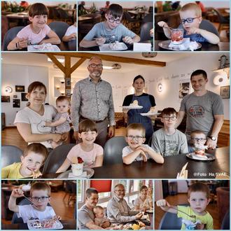 Anfang August war es soweit. Jens Scharff spendierte den Zwillingen Bruno und Benno sowie deren Geschwistern Judy, Levi, Tessa, Jim und Sina (die leider wegen Krankheit fehlte) jeweils einen leckeren Eisbecher beim Auerbacher „Eis-Dealer“. Selbstverständlich waren dazu auch die Eltern der Kinder Lucia und Jörg Borisch eingeladen.
