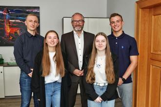 (auf dem Foto von links: Ausbilder Chris Krüger, Angelina Giesecke, OB Jens Scharff, Annika Thoß, Nevio Reich)