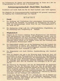 Bei diesen Sitzungen wurde ein Statut erarbeitet, dazu verschiedene Entwürfe diskutiert. Als „Rechtsbeistand“ hatten wir einen selbstständigen Rechtsanwalt, Herrn Marquardt aus Auerbach hinzugezogen, der letztendlich die Entfassung des Statutes erarbeitete. Dieses Statut reichten wir beim Rat der Stadt Auerbach zur Genehmigung ein. Im März 1983, unter 14/83 registriert, war dies das Geburtsdatum unserer ATG. Durch Unterschrift der Teilnehmer in der Beitrittserklärung wurde das Statut legitimiert.