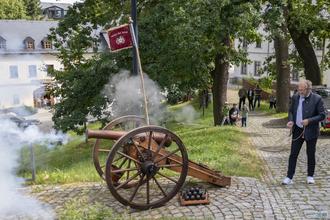 Punkt 12 Uhr trafen sich dazu am Schlossturm die Mitglieder und Freunde der Schützen-Gesellschaft. Mit drei kräftigen Kanonen-Böllern - die Oberbürgermeister Jens Scharff zündete - begann die Geburtstagsparty. Mit ihren 300 Jahren ist die Schützengesellschaft der älteste Verein in Auerbach. Aktuell gehören rund 90 Mitglieder dazu.