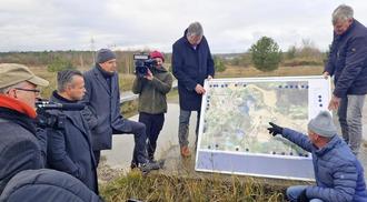 Erik Lange (r.) von der Unteren Wasserbeörde des Landkreises Nordsachsen zeigt auf einem Luftbild die Schwachstelle.