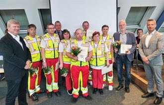 Der Vorsitzende des Kreistages Anhalt-Bitterfeld, Veit Wolpert (links), und Landrat Andy Grabner (rechts) überreichten im Auftrag des Landes Rheinland-Pfalz die Fluthilfemedaillen an die Einsatzkräfte des Deutschen Fördervereins für Sanitätswesen e. V.