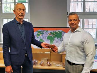 Dr. Anselm Krumbiegel (links) überreich symbolischer ein Stück der wertvollen Bernsteinsammlung an Landrat Andy Grabner.