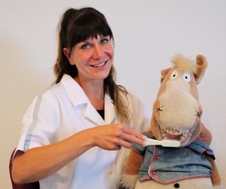 Schwester Katja zeigt den Kindern am Zahnputzpferd Jimmy, wie Zähne richtig geputzt werden.
