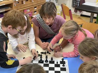 Erzieherin Andrea Schilling (Mitte) erklärt den interessierten Erstklässlern wie die Schachfiguren aufgestellt werden.
