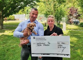 Auch in diesem Jahr unterstützt der Landkreis die Trägereinrichtungen der Tierheime. Zum Auftakt überreichte Landrat Andy Grabner einen symbolischen Scheck in Höhe von 9.000 Euro an Tierheimleiterin Grit Bürger und Yorki-Mix Brownie vom Bitterfelder Tierheim. Geld, das vor allem die 30 Hunde und 120 Katzen, die derzeit im Tierheim „wohnen“, gut gebrauchen können. Grit Bürger berichtet, dass immer mehr alte und verletzte Tiere, die kaum vermittelt werden können, aufgenommen werden müssen. Das verursacht natürlich hohe Kosten für eine tierärztliche Behandlung.