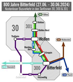 Die Linien 405 und 406 verkehren mit zusätzlichen Fahrten stündlich und stellen auch eine Abreise vom Festgelände am Donnerstag bis 22:20 Uhr ab Ersatzhaltestelle Stadtverwaltung (Höhe ASB Sozialstation an der Kreuzung Binnengärtenstraße), Freitag und Samstag bis 1:20 Uhr stündlich und Sonntag bis 21:05 Uhr stündlich sicher. Die beiden Linien sichern einen halbstündlichen Takt zum Bahnhof Bitterfeld.