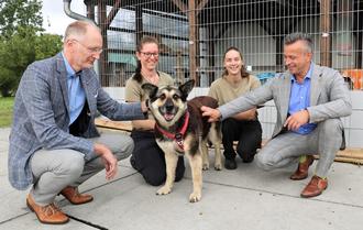 Die neun Jahre alte Schäferhündin Sonja wohnt seit Februar im Tierheim Zerbst und wartet hier auf ein neues, liebevolles Zuhause. Sie mag es sichtlich, wenn sie verwöhnt wird. Reichlich Streicheleinheiten erhielt sie von Andreas Dittmann, Pamela Strahler, Tierheimmitarbeiterin Julia Senst und Andy Grabner (v. l. n. r.).
