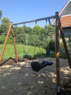 Die neue Schaukel ist aktuell noch mit einem Bauzaun abgegrenzt, da das umliegende Areal neu mit Rasen eingesät wurde. Voraussichtlich im September wird der Bauzaun rückgebaut und die Schaukel zur Benutzung freigegeben.