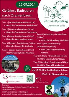 An diesem 22. September werden geführte Radtouren aus verschiedenen Orten der Region angeboten und anschließend gibt es auf und um den Marktplatz in Oranienbaum noch eine Menge zu erleben.