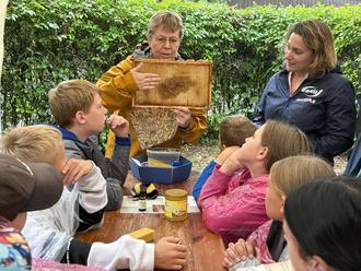 Beim Projekttag „Natur zum Anfassen“ zeigt Susanne Grießbach, Leiterin im „Haus am See“ Schlaitz (m.), Bitterfelder Schülerinnen und Schülern eine Bienenwabe.