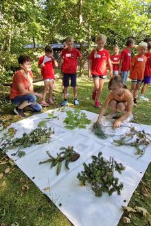 Die KInder testen ihr Wissen über die heimischen Laub- und Nadelbäume.
