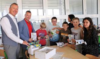 Die von Landrat Andy Grabner (2.v.l.) und Andreas Rößler mitgebrachte Entdeckerbroschüre findet Anklang bei den Kindern.