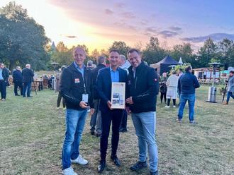 Daniel Krake (m.) gratuliert Herrn Geschäftsführer Dr. Jörg Bühnemann (r.) und Wolfgang Zahn (l., Projektmanager Landwirtschaft der AMG) zum 30-jährigen Firmenbestehen und überreicht ein kleines Präsent seitens des Landkreises Anhalt-Bitterfeld
