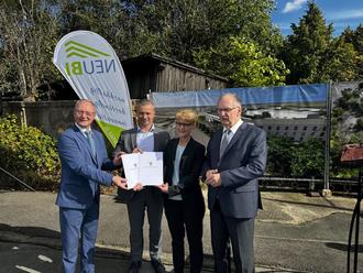 (v.r.n.l.) Dr. Reiner Haseloff, Ministerpräsident Sachsen-Anhalt, Susann Schult, Geschäftsführerin der NEUBI, Landrat Andy Grabner und Armin Schenk, Oberbürgermeister Bitterfeld-Wolfen, bei der Übergabe der Förderbescheide