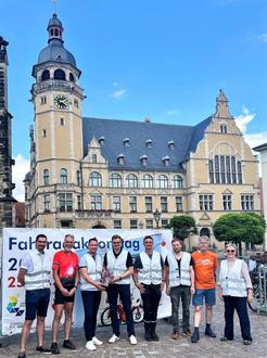 Das Organisationsteam des allerersten Fahrradaktionstages des Landkreises Anhalt-Bitterfeld vom 25.6.2023 mit Staatssekretär Sven Haller (4. v . l.)