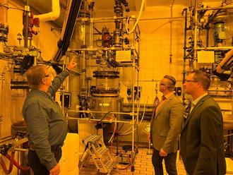 „Mithin haben wir ca. 100.000 Euro pro Jahr in den Standort investiert“, sagt Geschäftsführer Dr. Michael Gäbler und verweist dabei u. a. auf Modernisierungen im Gebäude- und Technikbereich. Im Rahmen der Betriebsbesichtigung erklärte Dr. Gäbler seinen Gästen beispielsweise eine Apparatur zur Herstellung von Photoinitiatoren im sogenannten Gelbraum. Im Gelbraum wird das UV-Licht herausgefiltert, um den Photoinitiator bzw. polymerisierbare Produkte zu schützen. Der Photoinitiator würde sich zersetzen und die polymerisierbaren Produkte würden unbeabsichtigt polymerisieren, also aushärten.
