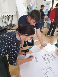 An Tag zwei konnten die Teilnehmenden des EU-Azubigipfels mit der Europaabgeordneten Karolin Braunberger-Reinold aus Sachsen-Anhalt über die EU sowie deren Zukunft und Einfluss auf ihre Ausbildung diskutieren. Wie wird die EU in zehn Jahren aussehen? Was könnte helfen, damit die EU in der Verwaltung wahrnehmbarer wird? Und wie lässt sich Mehrsprachigkeit in der Behörde als Kompetenz stärken? Den Auszubildenden war es aber auch wichtig darüber zu reden, wie die eigene Ausbildung insgesamt noch mehr Europabezug haben kann. Angeregt durch das Planspiel, aber auch durch das eigene Erleben im Praxisteil der Ausbildung, stellten die Azubis Sprachkompetenzen, insbesondere Englisch, als unabdingbaren Bestandteil der Ausbildung heraus. Sie warben dafür, Englisch als Ausbildungsinhalt zu integrieren. Hierfür und für noch mehr Europa in Anhalt-Bitterfeld in der Ausbildung planen die Azubis nach dem EU-Azubigipfel ein Gespräch mit der zuständigen Berufsschule.