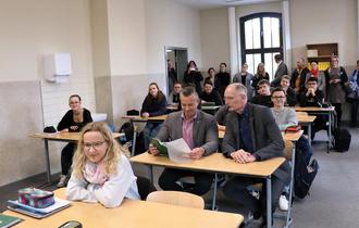 Andy Grabner und Andreas Dittmann beteiligen sich im sanierten Schulgebäude am Unterricht.